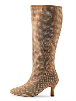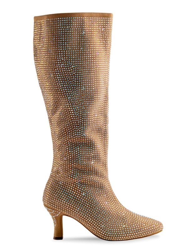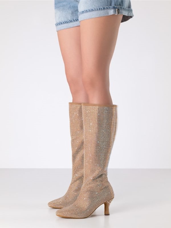 Anna Kern super flot dansestøvle er et sand blikfang på dansegulvet – en knæhøj danseboot prydet med hundredevis af glitrende rhinsten, som giver spektakulær glans til hvert eneste trin. Fremstillet i beige mikrofiber, der ikke kun giver et moderne look, men også fleksibilitet og maksimal komfort. Elegant 6 cm flare-hæl der giver den perfekte balance mellem højde og stabilitet – ideel til latin, showdance, salsa eller sceneoptrædener. Den tætsiddende pasform fremhæver benets linjer og giver perfekt støtte helt op til knæet, mens den polstrede sål sikrer blød komfort – selv under lange forestillinger. Nikkelfri lynlås.