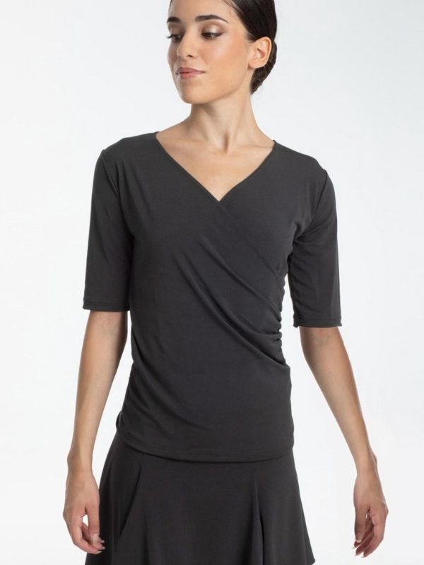 Intermezzo standard/latin danse bluse med elegante albuelange ærmer og et stilfuldt krydsdesign foran. Blusen er forsynet med let rynkede syninger langs siderne, hvilket giver en flatterende pasform, fremhæver bevægelse og tilføjer et strejf af sofistikering - ideel til både standard- og latindans