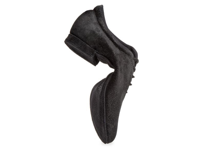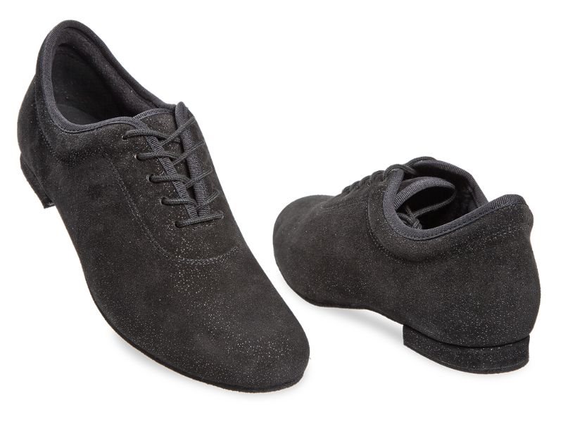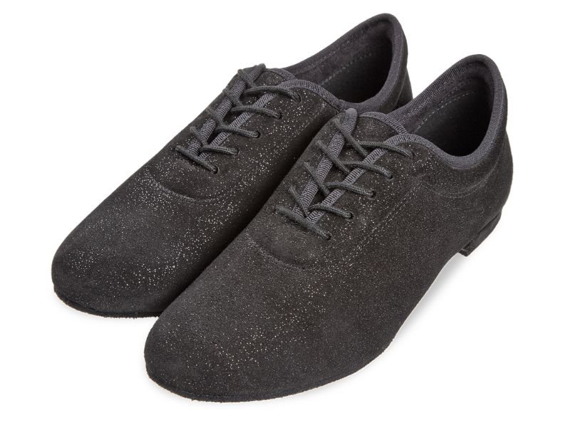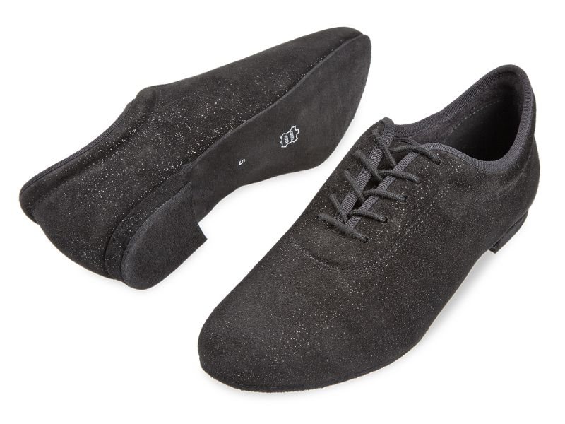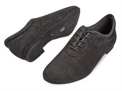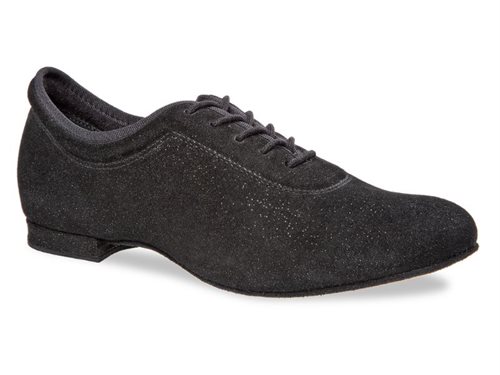 Diamant flot lav dansesko med sølvglitter. Disse håndlavede træningsdansesko er designet til den danseglade kvinde, med en 5-huls snøring der sikrer en optimal pasform. Skoen er let, fleksibel og har en rund snude i normal bredde med splitsål, der øger fleksibiliteten. Lav1,2 cm blokhæl forbedrer balance og sikkerhed. Indersiden er foret med åndbar, fugtabsorberende mikrofiber af høj kvalitet, mens det sorte velourlæder med sølvfinish tilfører et diskret, skinnende look. Produceret i Tyskland med italienske materialer.