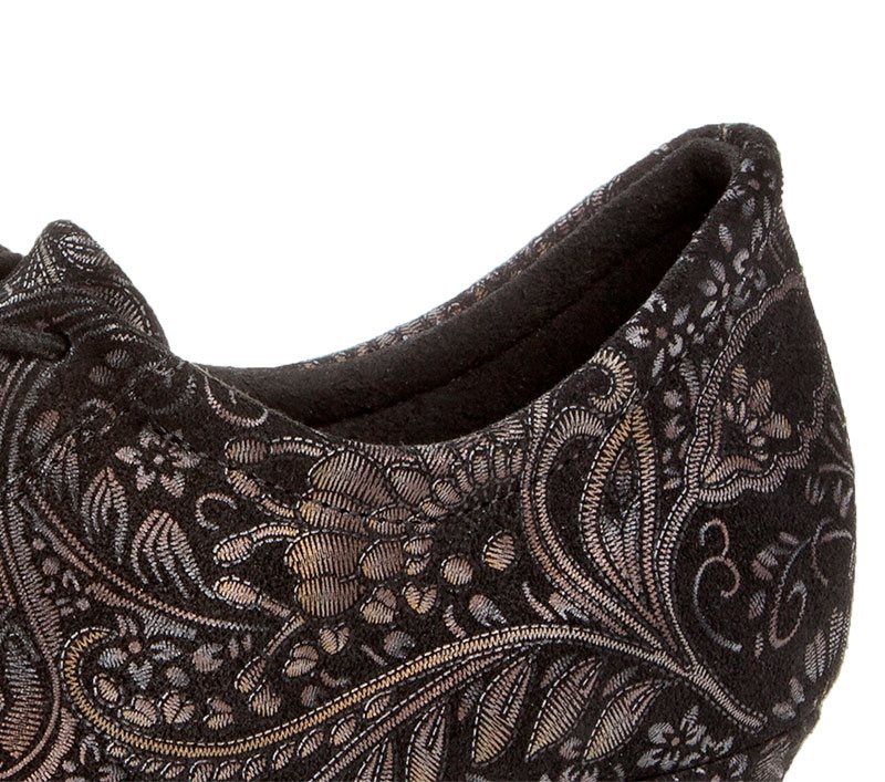 Danseskoen er håndlavet i Tyskland med 5-hullers snøring. Denne dansesko er normal bredde med Diamant komfort indersål og en stabil 3,7 cm cubansk hæl med meget stor trædeflade. Som indvendigt for er der anvendt et åndbart og fugtabsorberende mikrofiber af italiensk premium-kvalitet. Overmaterialet er i sort velourlæder fra italien med rokokoprint med kobberfarvet blomster.
