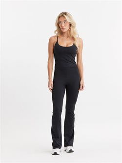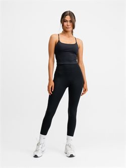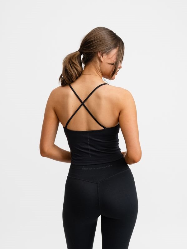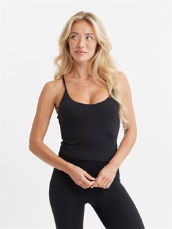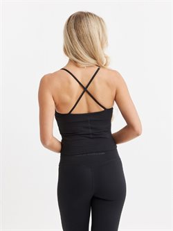 Den dybe, afrundede udskæring foran og den åbne ryg med fine, tynde stropper skaber en elegant silhuet. Med indbygget bh og udtagelige indlæg er det en top, der er nem at bære og style – lige så oplagt til træning som til hverdagsbrug.