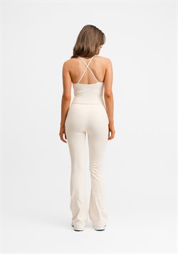 Den dybe, afrundede udskæring foran og den åbne ryg med fine, tynde stropper skaber en elegant silhuet. Med indbygget bh og udtagelige indlæg er det en top, der er nem at bære og style – lige så oplagt til træning som til hverdagsbrug.