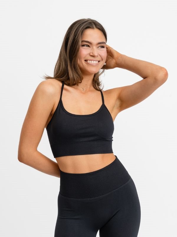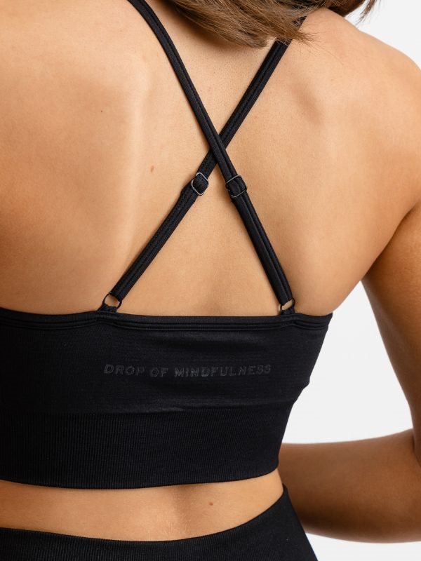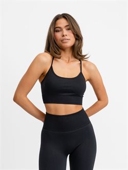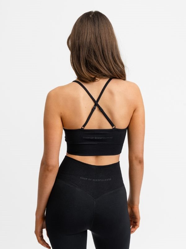 Signature seamless sports bh i sort fra Drop of mindfulness er meget blød og behagelig med justerbare stropper, der krydser ryggen. Sports-bh'en har en rib under brystet for bedre støtte, så du kan føle dig godt tilpas til alle former for træning. Bh toppen har puder der let kan tages ud. Normal i størrelsen, men anbefalingen er, at du går en størrelse ned, hvis du ligger mellem to størrelser. Ved produktion af denne top tænkes der på miljøet, da rundstrik minimerer produktionsspild.