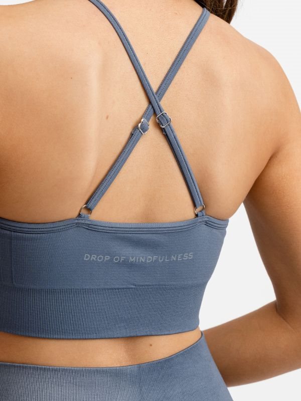 Signature seamless sports bh i blå fra Drop of mindfulness er meget blød og behagelig med justerbare stropper, der krydser ryggen. Sports-bh'en har en rib under brystet for bedre støtte, så du kan føle dig godt tilpas til alle former for træning. Bh toppen har puder der let kan tages ud. Normal i størrelsen, men anbefalingen er, at du går en størrelse ned, hvis du ligger mellem to størrelser. Ved produktion af denne top tænkes der på miljøet, da rundstrik minimerer produktionsspild.