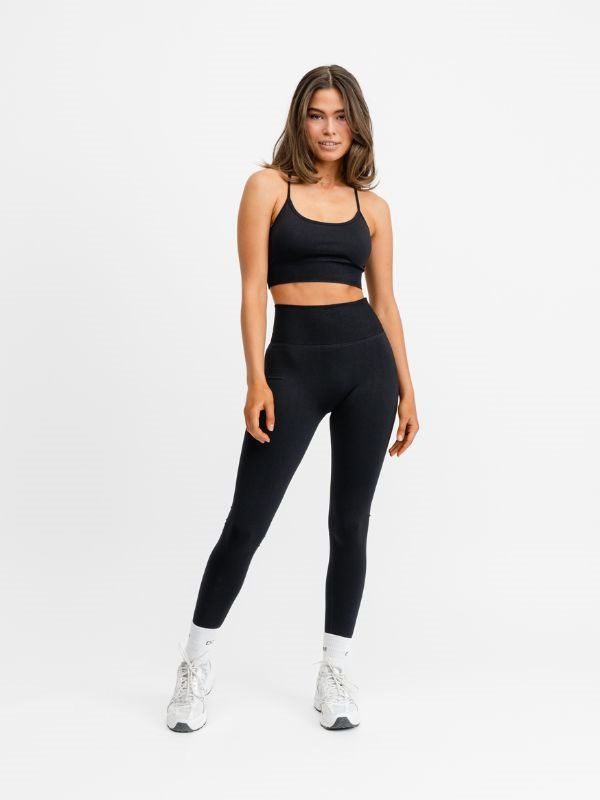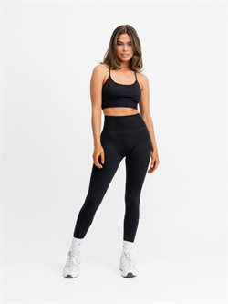 DOM Signature sorte seamless tights. Musthave i træningsgarderoben. Komfortable og bløde træningstights giver dig en behagelig "second-skin" følelse og har en flatterende V-form bagpå. Med det brede ribbede taljebånd sidder alt på plads under hele træningen. Uanset om du løber, danser, træner, laver yoga eller bare vil have en behagelig hverdagstights, så er disse tights perfekte. Lavet af 92% Poliamid og 8% Elastan, sikrer de optimal bevægelsesfrihed. Vaskes ved 30 grader med lignende farver og undgå brug af skyllemiddel og tørretumbling.