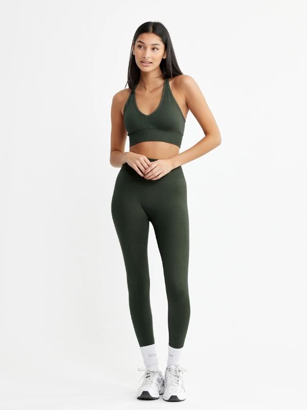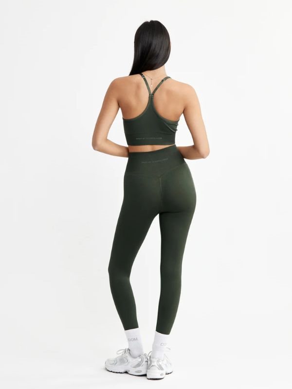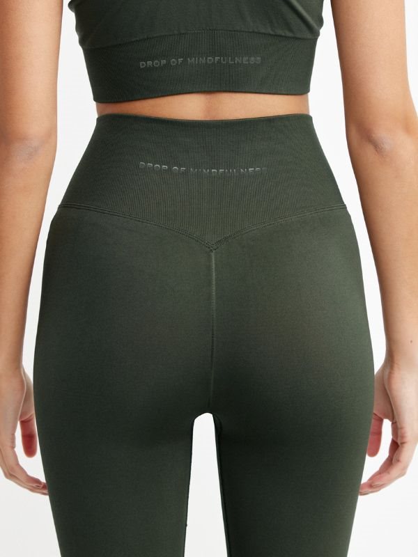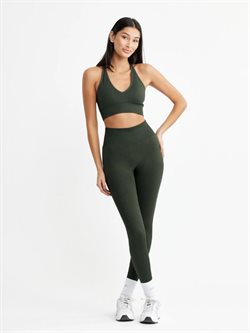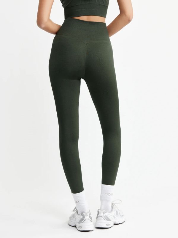 DOM Signature mørkegrønne seamless tights. Musthave i træningsgarderoben. Komfortable og bløde træningstights giver dig en behagelig "second-skin" følelse og har en flatterende V-form bagpå. Med det brede ribbede taljebånd sidder alt på plads under hele træningen. Uanset om du løber, danser, træner, laver yoga eller bare vil have en behagelig hverdagstights, så er disse tights perfekte. Lavet af 92% Poliamid og 8% Elastan, sikrer de optimal bevægelsesfrihed. Vaskes ved 30 grader med lignende farver og undgå brug af skyllemiddel og tørretumbling.
