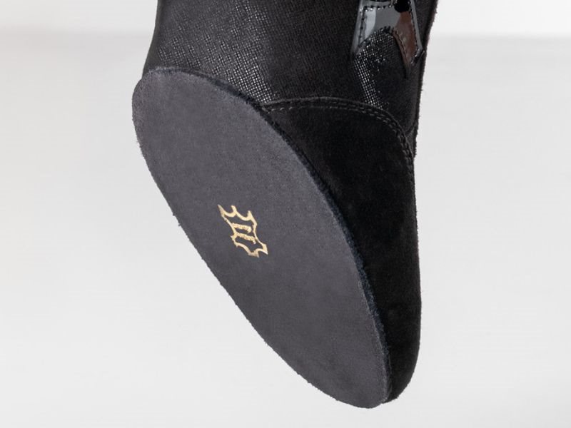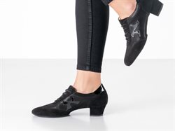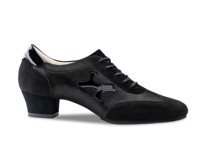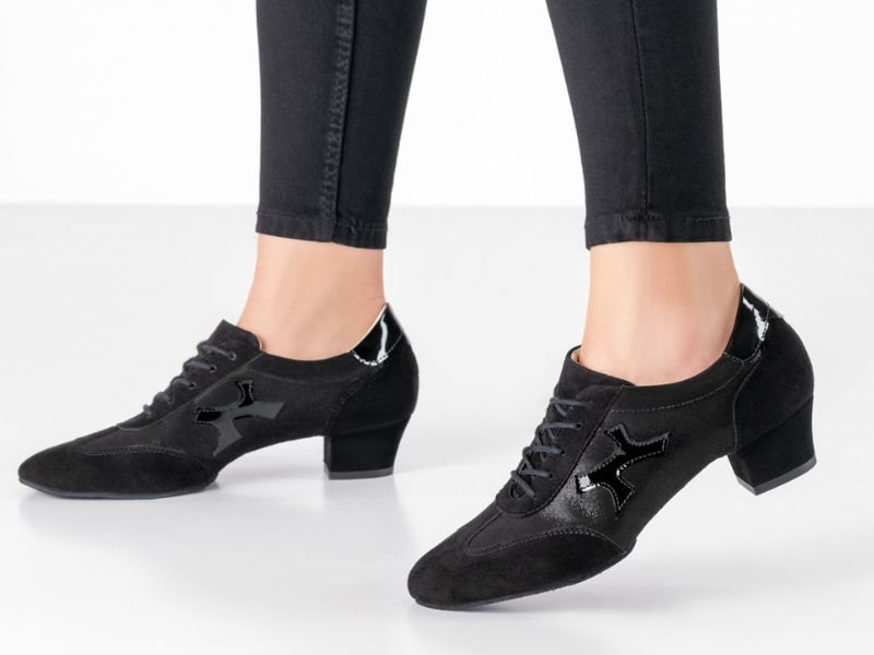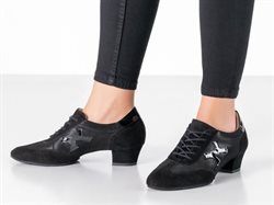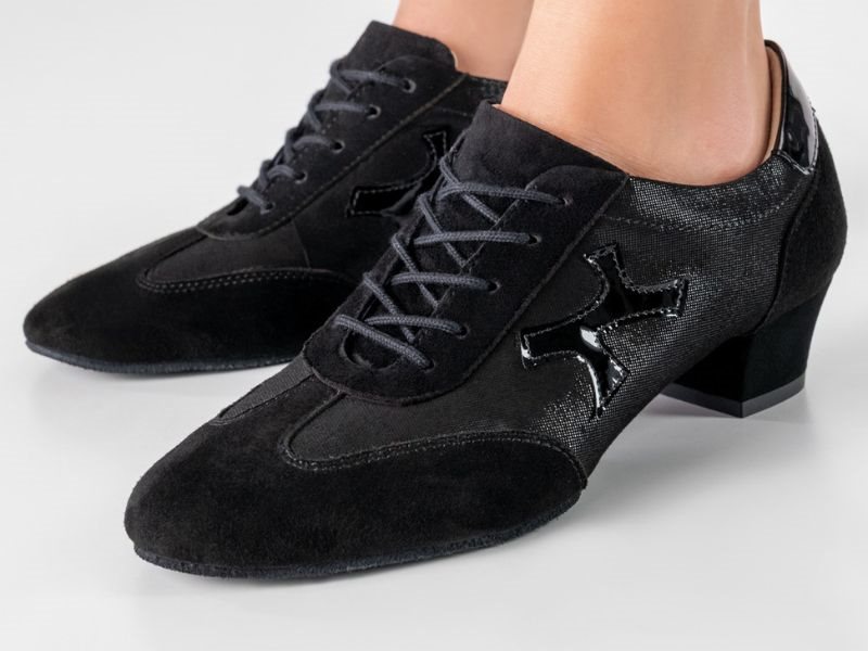 Werner Kern "Bruni" sort dame træningssko til dans. Designet specielt til den modebevidste danser, kombinerer denne sko klassisk sort med en blanding af blødt ruskind, let skinnende velour og blankt laklæder, der tilfører et moderne og stilfuldt præg. Hælhøjde på 3,5 cm og en ekstra blød latex-mellemsål, fremragende støtte og affjedring, hvilket gør danseskoen ideelle til lange danse sessioner.